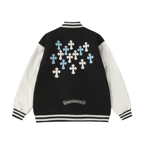 Cross Embroidered Leather Sleeve Varsity Jacket - Black Street Style 116